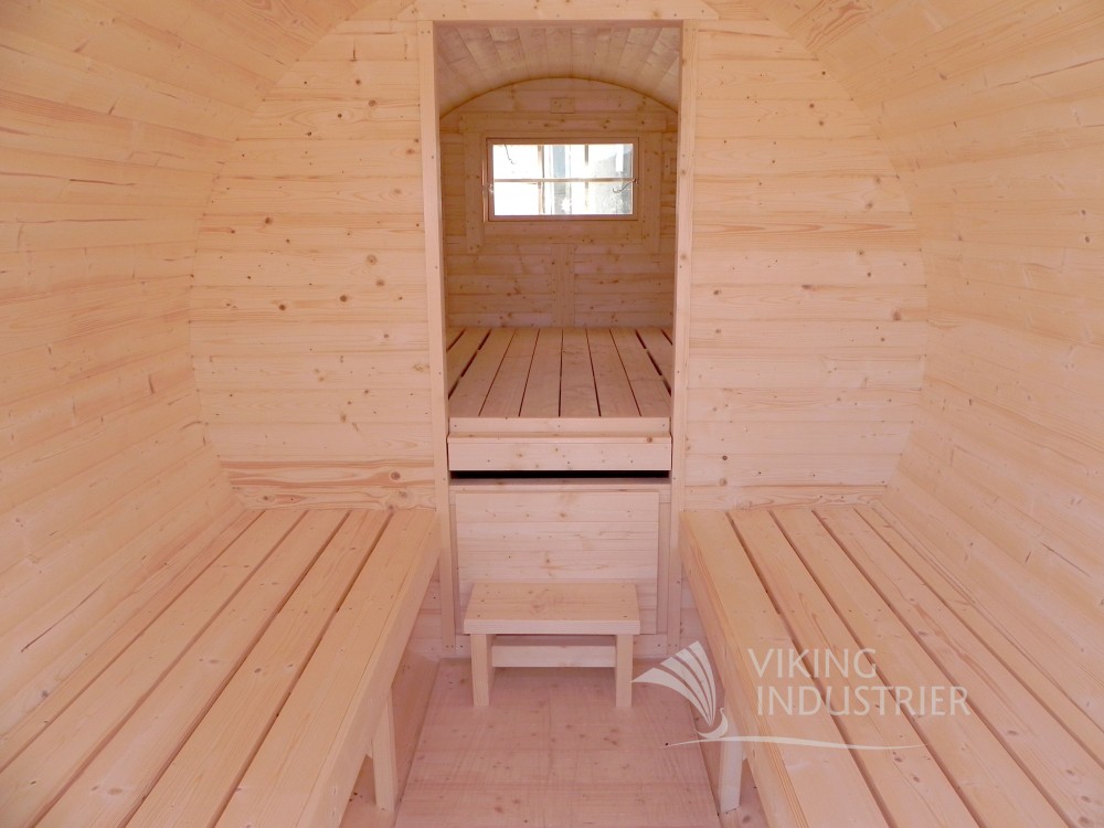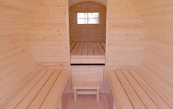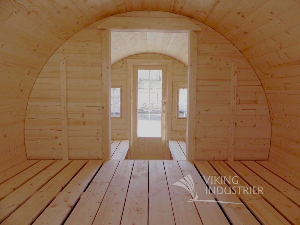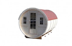 Two adults and two children can easily fit in our sleeping barrel. The size of sleeping space is 2 x 2 m. The living room is very spacious and has two long benches for it. The size of bench is (D x L) 600 x 2086 mm.There is a sliding table in the sitting room; it can be hidden when it is not needed. The sleeping barrel has one opening window in the back wall and two opening windows in front.The lockable door with a big rectangular window. A roof is covered with bitumen shingles, whichever is preferred.