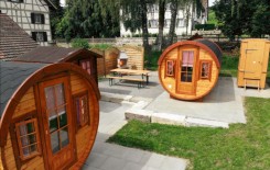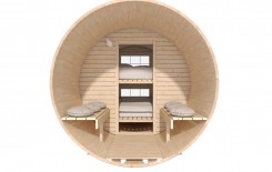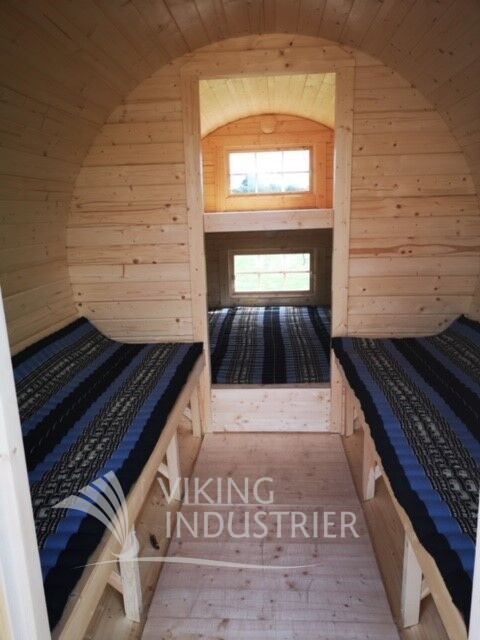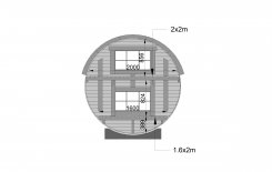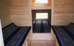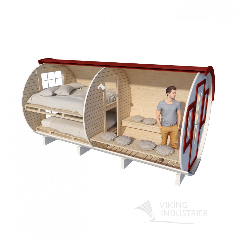 This barrel can accommodate up to 8 person.. Two rooms inside: a sleeping room and a sitting room. Sitting room has two benches. The size of bench is (W x L) 600 x 2080 mm. The size of sleeping room with a upper sleeping space is (W x D) 2 x 2 m and the size of lower sleeping space is 1.6 x 2 m. The height between the first bed and the second beds is 0.82 m and the height between the second bed and the roof is 0.85 m.
