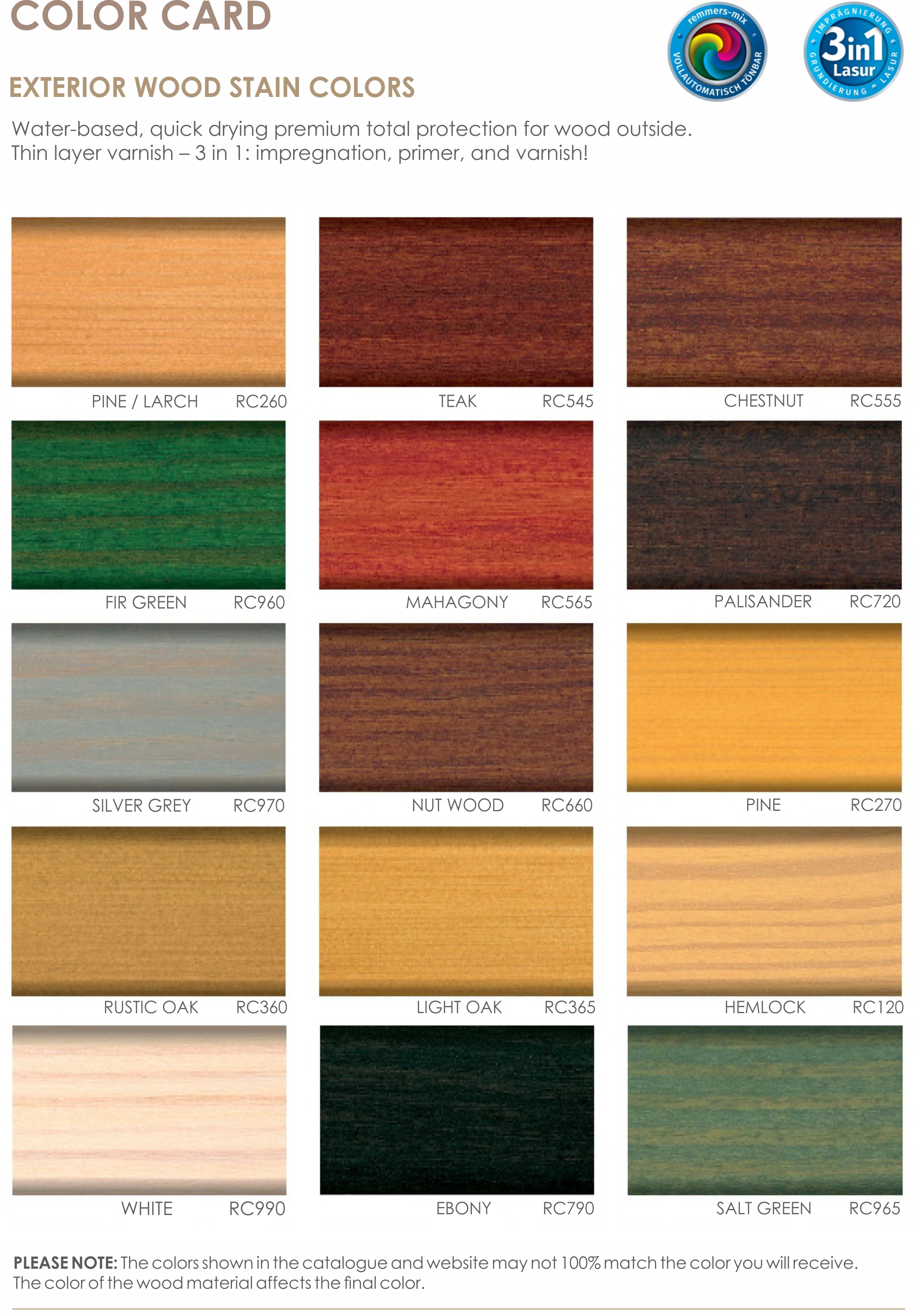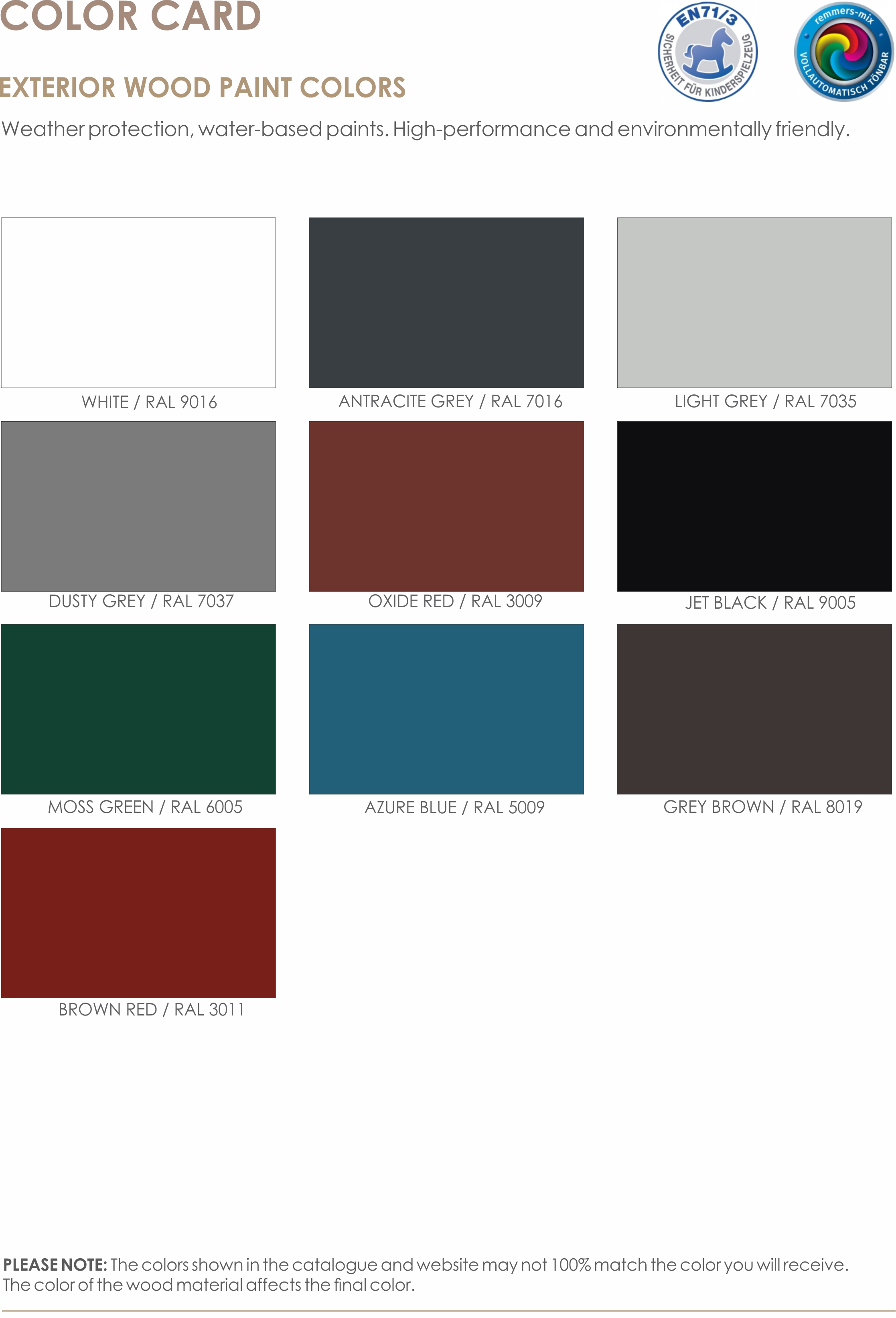 The high-quality preservative finish is professionally spray applied in the factory to three sides of the wood. The product is treated in your choice of color. You can choose two colors for one product: one for almost all product details and another for finishing details.