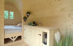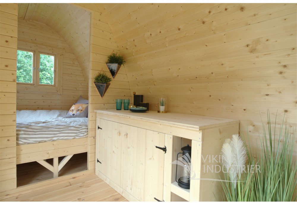 This new design Camping Pod with side entrance is hand build and perfect for 2 - 4 adults. 2 rooms inside separated with partition wall of sizes: 1.40 m perfect for bedroom and 4 m long for kitchen and lounge area.