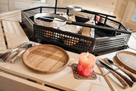 There is a convenient wood- or charcoal-fired grill with a table around it inside the cabin.
