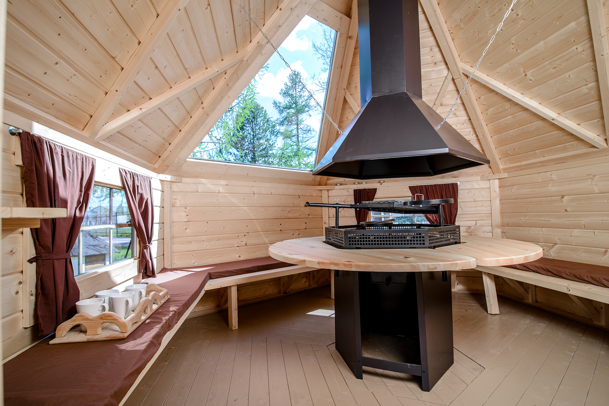 High-quality materials ensure the longevity of a grill house and easy use. Eight cabin walls are made of rounded spruce boards with the dimensions 45 x 145 mm.