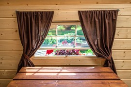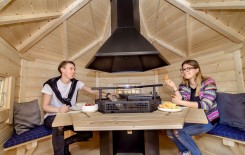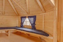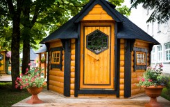 Three spruce benches line the walls, providing ample seating for your culinary companions. The easily assembled floor and lockable door add to the cabin's convenience, while the charming hexagonal window above the door infuses the interior with natural light.