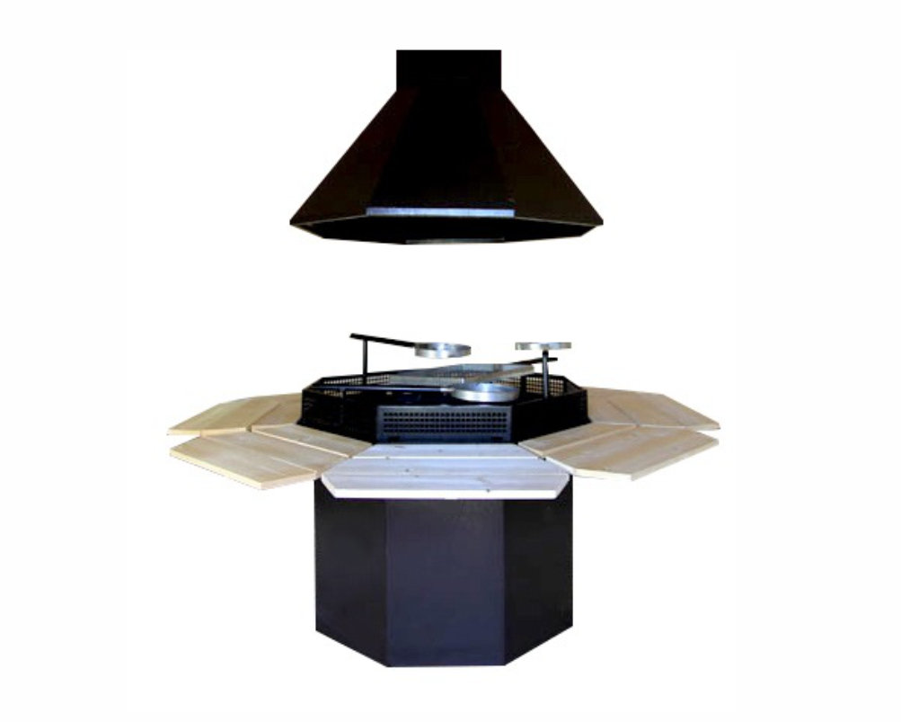 | Inside grill with cooking platforms and tables around the grill; |