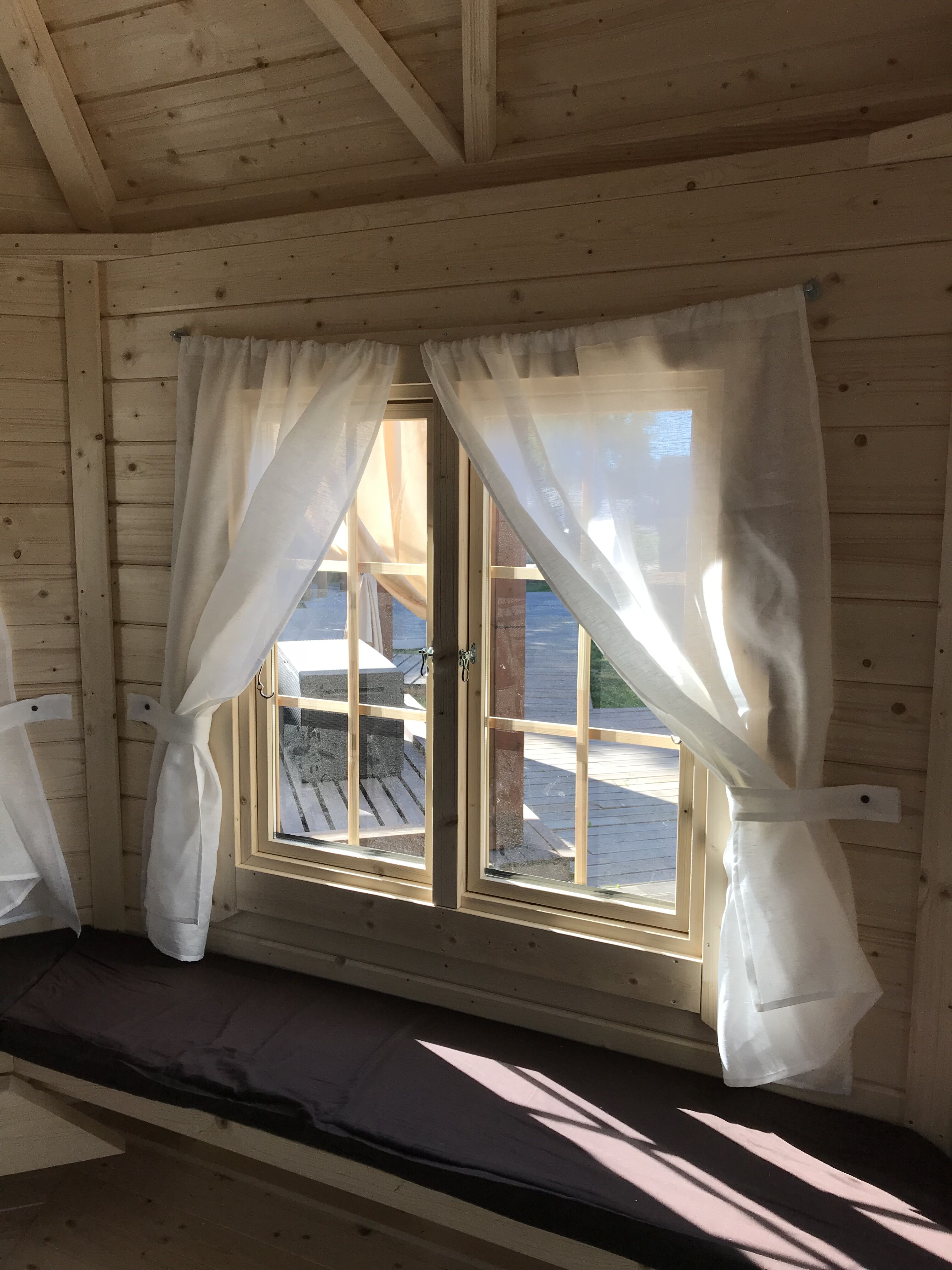 The Pavilion is made of high quality spruce wood, and the walls are made of rounded spruce boards with the dimensions 45 x 145 mm. A roof is made of six elements, thus the system can withstand a considerable weight. The roof of the Pavilion is covered with bitumen shingles, and there are five double glazed windows, two of which open. Besides that, doors are double-hinged and glazed. Floor is easily assembled from separate components.